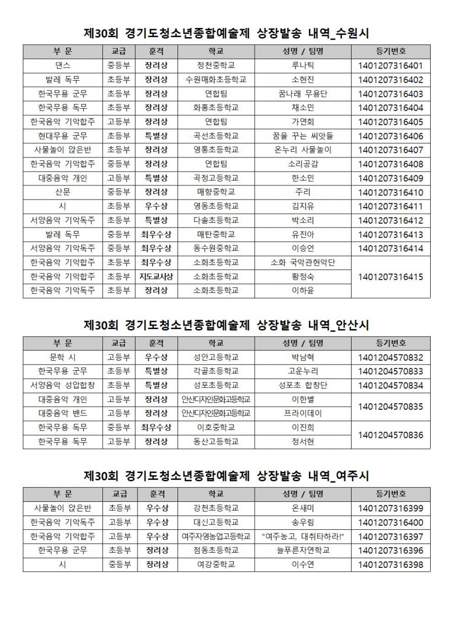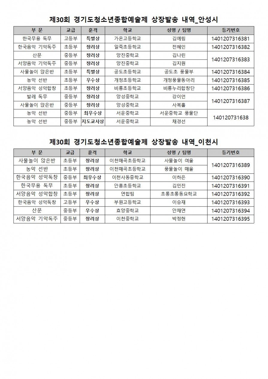 제30회 경기도청소년종합예술제 상장발송내역